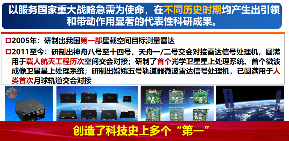 创造了我国科技史上多个“第一”:第一台电视发射接收装置、第一部低空测高雷达、第一个相控阵体制雷达、第一个微波成像星上处理系统、第一个空间交会对接测量微波雷达信号处理系统、第一个卫星通信阵列在轨测量装置等,深度服务于国土防护、航天遥感、载人航天、卫星导航等国家重大专项和重大工程。正在牵头“中国复眼”—大规模分布孔径深空探测雷达的建设。2011年以来,沙巴体育 牵头获得国家技术发明奖一等奖1项、二等奖6项。